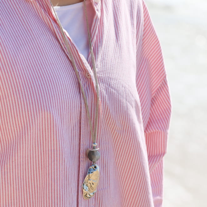 Affirmez votre style avec le sautoir Baignade, un bijou inspiré par l’océan et les trésors qu’il renferme. Son pendentif huître en métal , suspendu à un cordon en lin naturel, évoque la richesse et le mystère du monde marin. Complété par une perle en quartz gris, aux nuances douces et apaisantes, ce collier incarne la beauté brute des éléments naturels. L’association du lin et du métal argenté crée un équilibre parfait entre simplicité et originalité, faisant de ce sautoir un accessoire idéal pour un look unique et authentique.