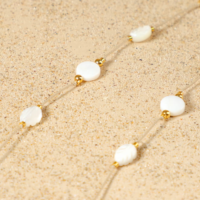 Craquez pour notre sautoir en perles Bardot. Avec son esprit naturel et raffiné, notre sautoir pour femme illumine une tenue en toute simplicité. Son cordon beige accueille une perle nacrée en forme de fleur et plusieurs perles délicates en nacre blanches : rondes ou en forme de feuilles. Les petites perles dorées apportent une touche de lumière et de nature, pour un bijou à la fois doux, féminin et intemporel.
