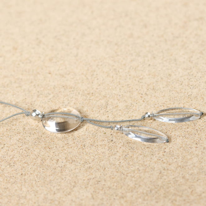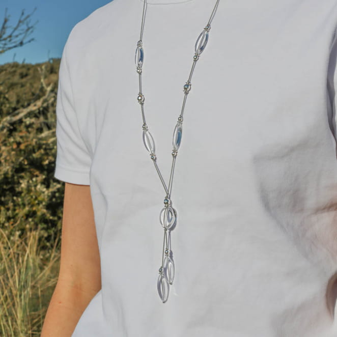 Laissez la lumière jouer avec le sautoir Batz, au charme délicat. Son cordon gris clair, souple et raffiné, est ponctué de perles transparentes et de perles facettées argentées qui captent chaque éclat. Un bijou aérien et lumineux, parfait pour apporter une touche d’élégance subtile à votre tenue.