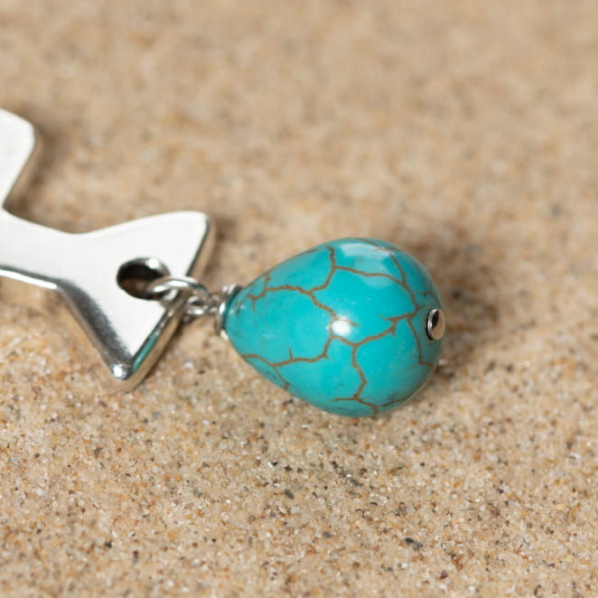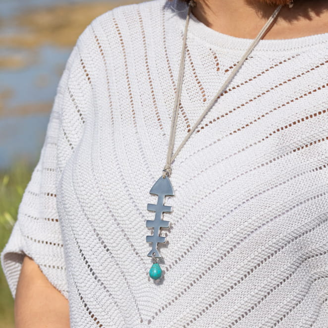 Adoptez une allure unique avec le sautoir Billy. Ce bijou en lin naturel, orné d'un pendentif en forme d'arête de poisson en métal argenté, est sublimé par une perle goutte en howlite bleu turquoise. Il apporte une touche de couleur et d'élégance à votre tenue.