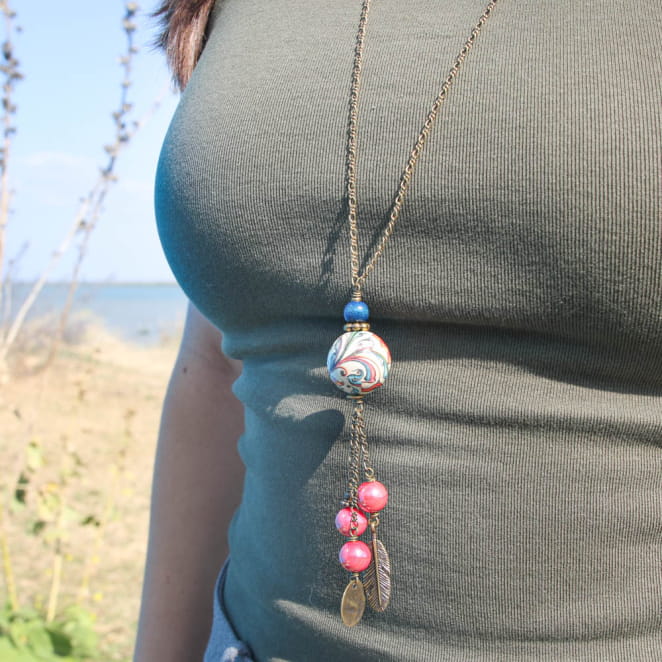 Ajoutez une touche d'originalité avec le sautoir Chaise en bronze. Délicat et doux, il se porte confortablement au quotidien. Ses perles en verre rouge et en bois bleu apportent des couleurs agréables, faisant de ce bijou un incontournable de votre collection.