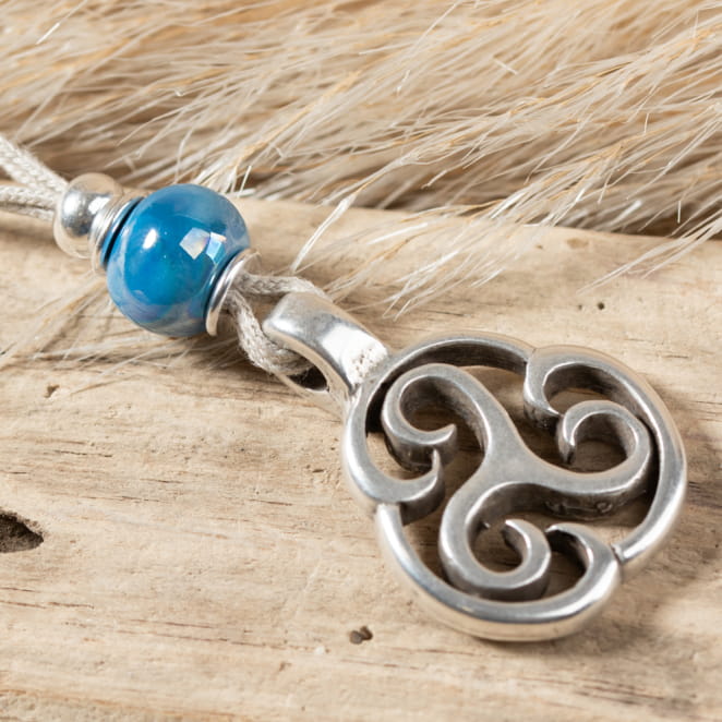 Le sautoir en lin Enora incarne l'esprit de la Bretagne avec son pendentif triskel argenté : agrémenté d'une perle en céramique bleu pétrole, ce bijou allie élégance et tradition. voir plus