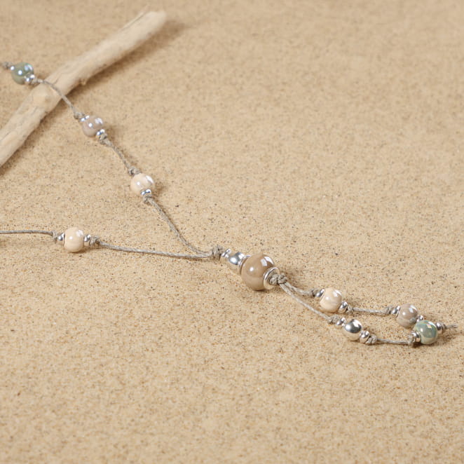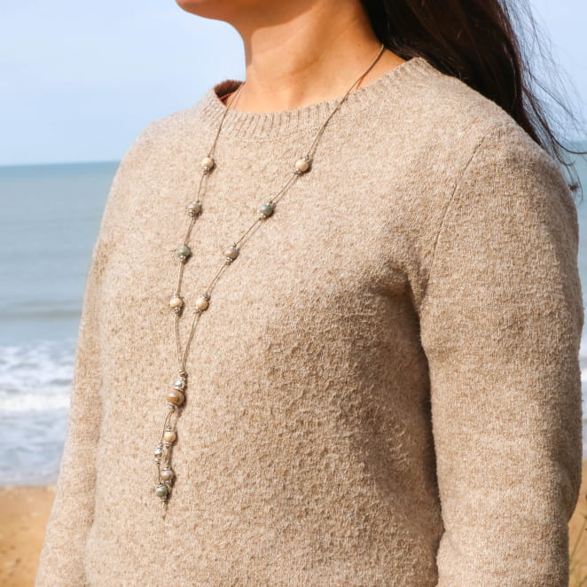 Laissez-vous envoûter par la beauté brute de la nature avec le sautoir Jelena. Ce sautoir, inspiré par les éléments naturels, évoque la douceur des paysages sauvages et la sérénité des bords de mer. Son cordon en lin naturel, ponctué de perles aux teintes douces et organiques, rappelle les trésors que l’on ramasse au gré des promenades sur le sable. Porté sur une tenue bohème ou un look plus sophistiqué, ce bijou artisanal apporte une touche d’authenticité et de lumière, sublimant votre style avec une élégance simple et naturelle !