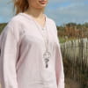 Le sautoir Noumea est un long collier original et moderne qui vous rappelle des souvenirs de vacances en bord de mer avec son cordon en lin beige et son pendentif poisson. Ce poisson articulé apporte un côté inédit à ce sautoir.