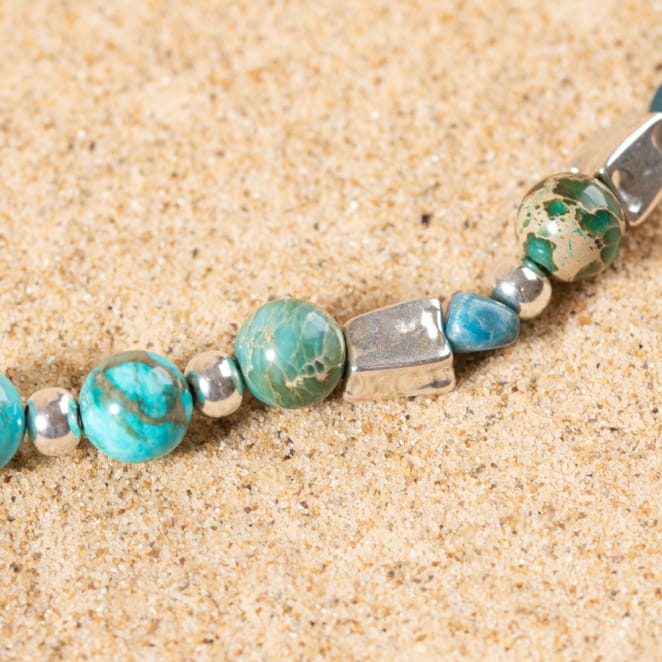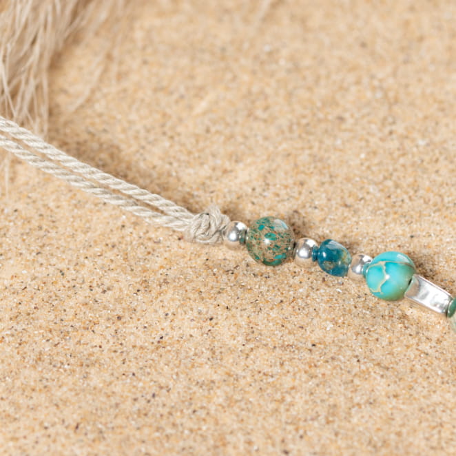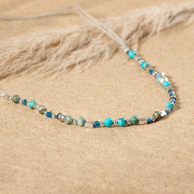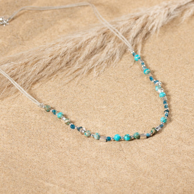 Le sautoir Tetiaroa illumine votre style avec ses teintes éclatantes. Composé de perles de jaspe bleu et d'apatite bleu, ce bijou délicat marie harmonieusement métal argenté et lin naturel. Parfait pour un look lumineux, il apporte une touche de nature et de raffinement à votre tenue, sublimant chaque instant avec élégance.
