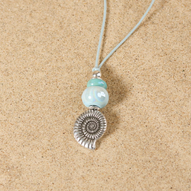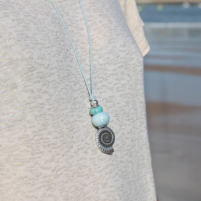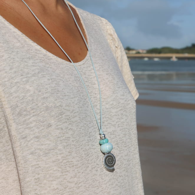 Apportez une touche naturelle et lumineuse à votre style avec le sautoir Upolu. Monté sur un cordon ciré bleu souple et résistant, il se pare d’un pendentif coquillage en métal plaqué argent 999, accompagné de perles en céramique verte et bleue aux reflets subtils. Des perles et rondelles en argentées rythment l’ensemble. Long et facile à porter, il se glisse sur toutes vos tenues pour un style décontracté chic, seul pour un rendu épuré ou combiné à d’autres colliers pour un effet superposé tendance.