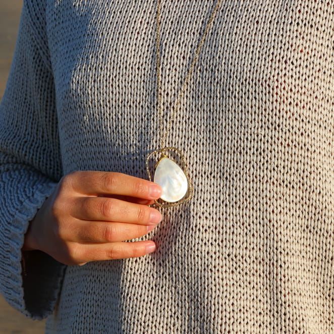 Laissez-vous séduire par l'élégance intemporelle du sautoir doré Yamina, une pièce raffinée et délicate. Conçu avec soin à la main sur l'île d'Oléron, il incarne le savoir-faire artisanal de Retour de Plage. Agrémenté d'une perle en nacre blanche en forme de goutte, ce bijou apporte une touche de classe à votre tenue. Son éclat doré illumine le teint et réchauffe le cœur, faisant de lui un accessoire indispensable pour rayonner en toute occasion !